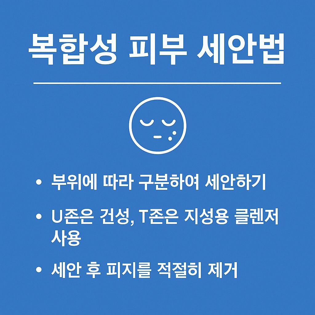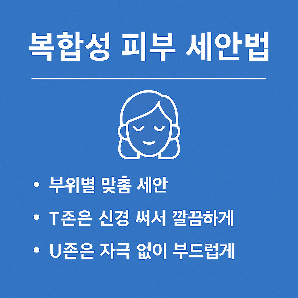 ③ 복합성 피부: 부위별 관리가 중요합니다. T존은 딥클렌징, 볼은 순한 클렌저를 사용하는 투 클렌징 방법이 효과적입니다.